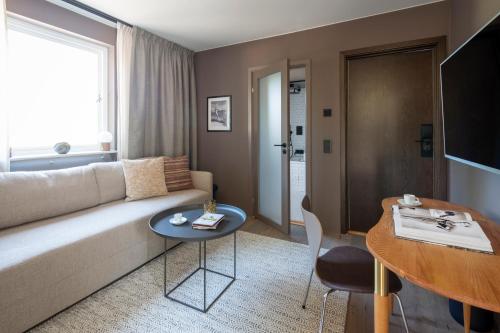 Här finns en tv, ett skrivbord och eget badrum med dusch.