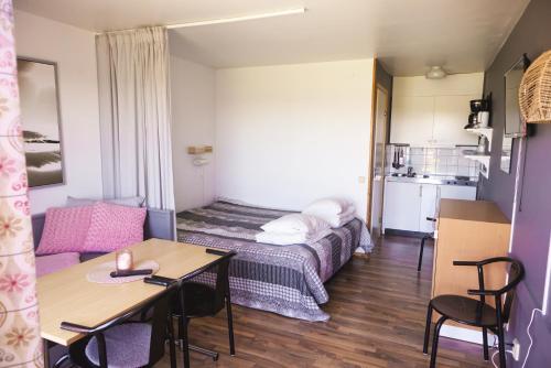 Du kan laga mat i det välutrustade pentryt, som har spishäll, kylskåp, kaffe- och tekokare samt köksutrustning. Studiolägenheten har eget badrum, sittgrupp, trägolv och matplats utomhus. Här finns 2 sängar.